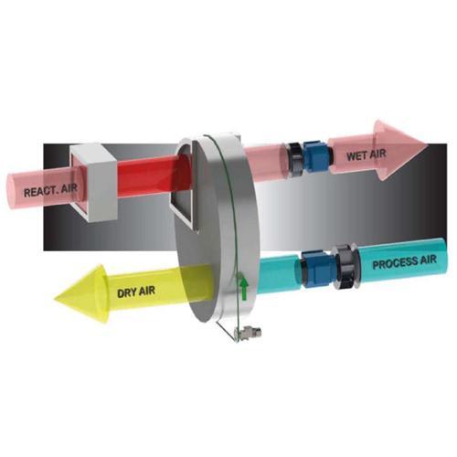 O Secador por Adsorção Industrial Fral FR1050 funciona com dois fluxos de ar, sendo o fluxo principal o ar a ser desumidificado, enquanto um segundo fluxo - com menor caudal - é utilizado para a regeneração do rotor de desumidificação. Duas ventoinhas no interior do desumidificador geram estes dois fluxos de ar que atravessam o rotor em direções opostas. O desumidificador industrial por adsorção Fral FR1050 tem uma capacidade de desumidificação de 8,8 kg/hora a 20 °C e 60 % de humidade.
